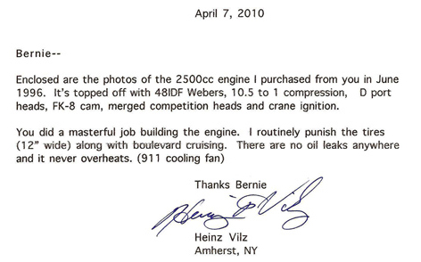 Sorry for the delay but here are newer pics of my car. The cockpit is now enclosed. Both doors now have added A and B pillars with molded roof openings for easier entry. The 2500cc engine you built for me is still my favorite, together with the 911 style cooling system and serpentine belt, you can`t beat it for looks and reliability. I have NOT had any mechanical issue of any kind and Iook forward to many more miles of fun!