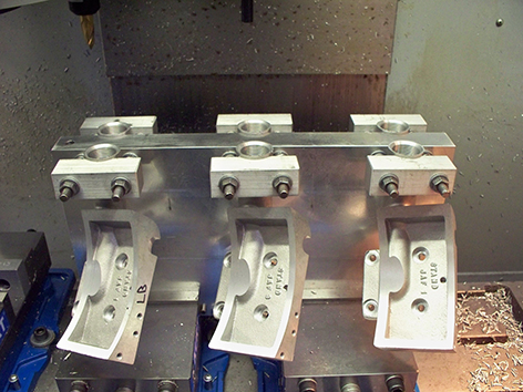 We have two identical fixture plates holding six stands each, fitted with steel dowel pins for accurate repositioning in the three vises.