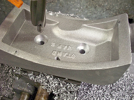 The stand is clamped down by an air vise for quick load and unload. The vise itself is bolted to a 300 lbs. cast iron table. The table has air pockets machined underneath and with a foot operated air valve when activated makes the table super light and floats on air like a feather. Using a piloted countersink cutter makes for effotless alignment and machining.